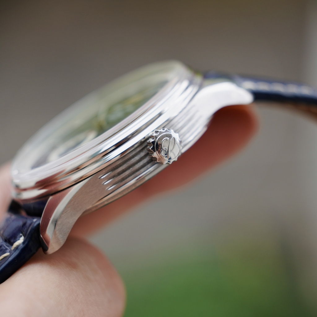 - Dial xanh chải tia kết hợp kim rốn góc 6h khiến chiếc đồng hồ có vẻ ngoài cực kỳ lịch lãm.