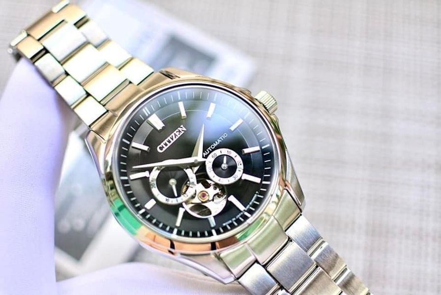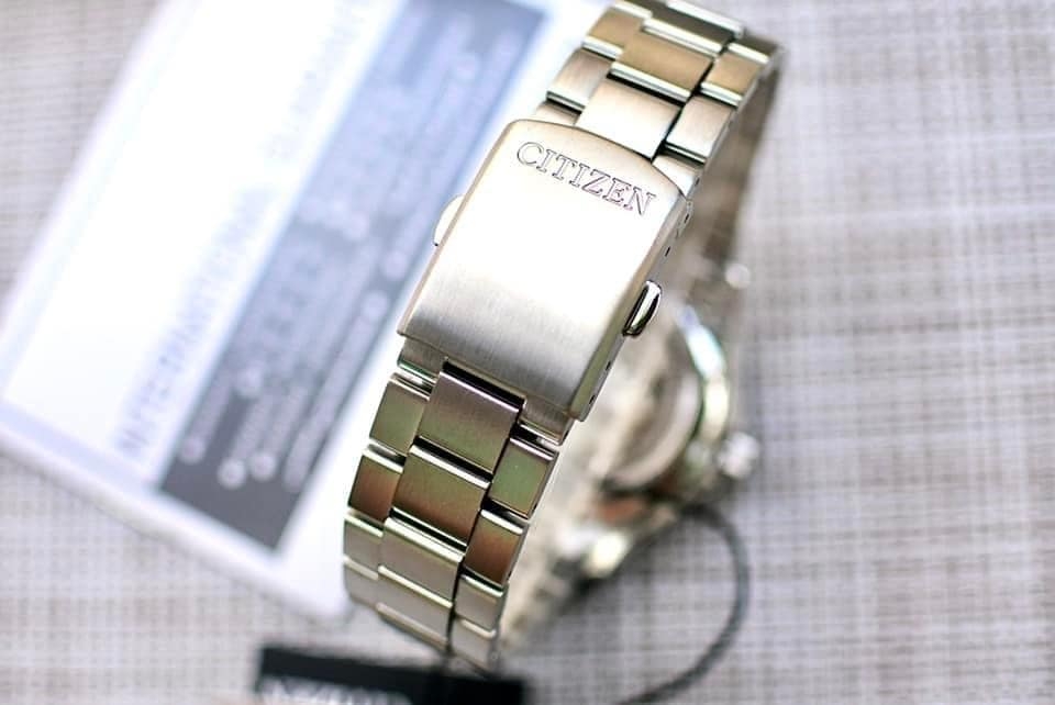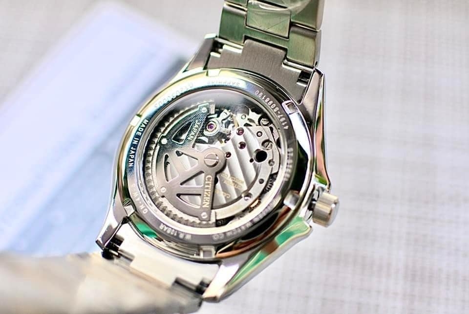 Citizen Automatic NP1010-51E thiết kế tạo nên sự độc đáo dành cho phái mạnh với mặt đồng hồ bên dưới mặt kính Sapphire với 1 ô chân kính phô diễn ra 1 phần của bộ máy cơ đặc trưng nam tính kết hợp cùng các chi tiết vạch số dày dặn.