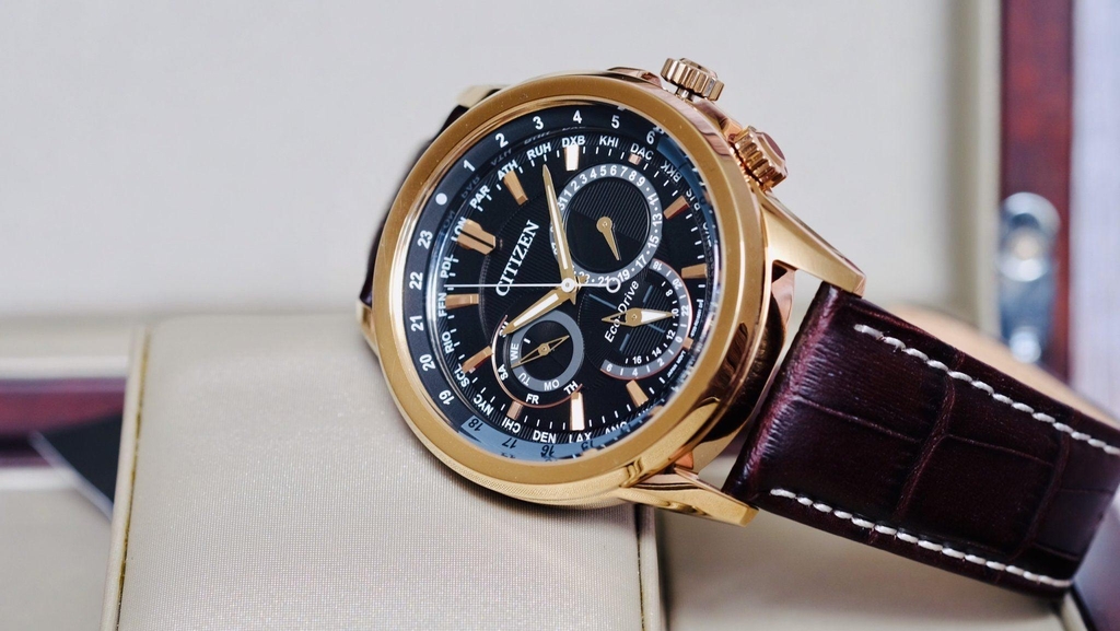 Đồng hồ Citizen BU2023-04E có vỏ kim loại bằng chất liệu thép không gỉ mạ màu đồng tinh tế quanh nền đen mặt số, mặt số hiển thị giờ thế giới một cách chi tiết, kim chỉ và vạch số được phủ phản quang nổi bật, đem đến phong cách thể thao mạnh mẽ nhưng không kém phần lịch lãm qua màu nâu của dây đeo bằng da.