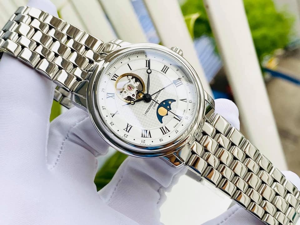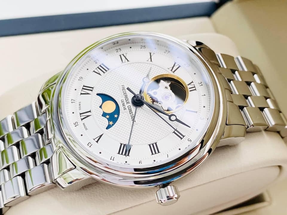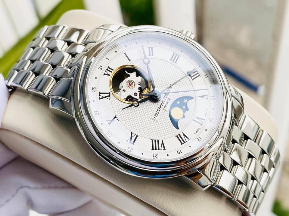 Với tính năng moonphase, chủ nhân của đồng hồ sẽ có thể quan sát chu kỳ của mặt trăng ngay trên cổ tay của mình. Trong khi đó, chức năng lộ cơ lại khéo léo phô diễn hoạt động của cỗ máy FC-335 phía bên dưới.