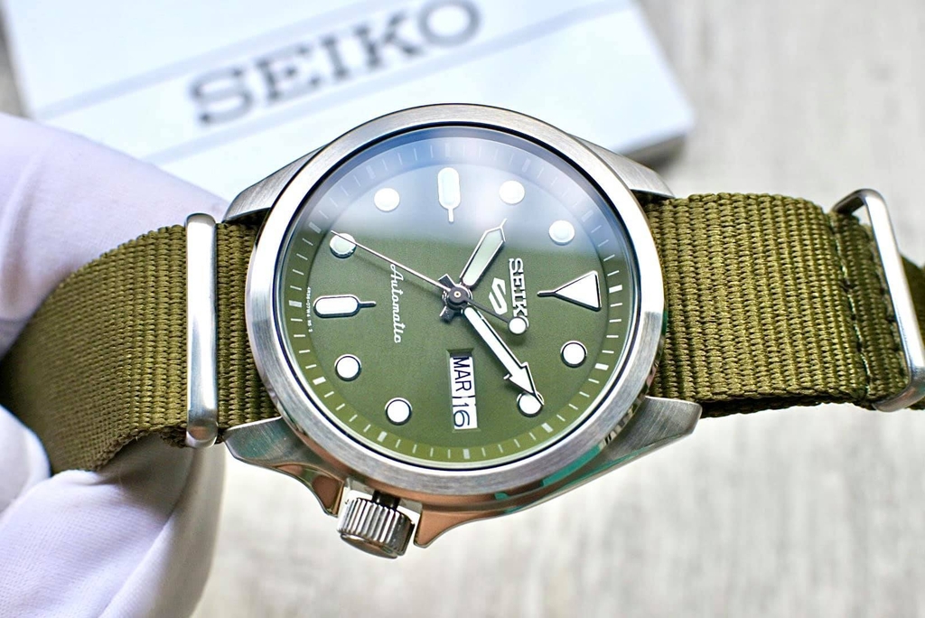 Mẫu đồng hồ nam thuộc bộ sưu tập Seiko 5 Sports với 5 đặc điểm: tự động lên dây cót, chống nước tốt, chống shock tốt, núm đồng hồ ở vị trí 4h, thứ và ngày được hiển thị cạnh nhau.