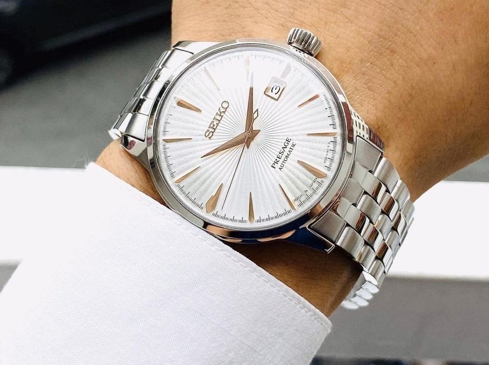 Dial chải tia đồng tâm cực kỳ bắt mắt, kết hợp cùng bộ kim cọc số tạo hình góc cạnh, cho hiệu ứng tán xạ ánh sáng tuyệt đẹp, đặc trưng của dòng Seiko Cocktail