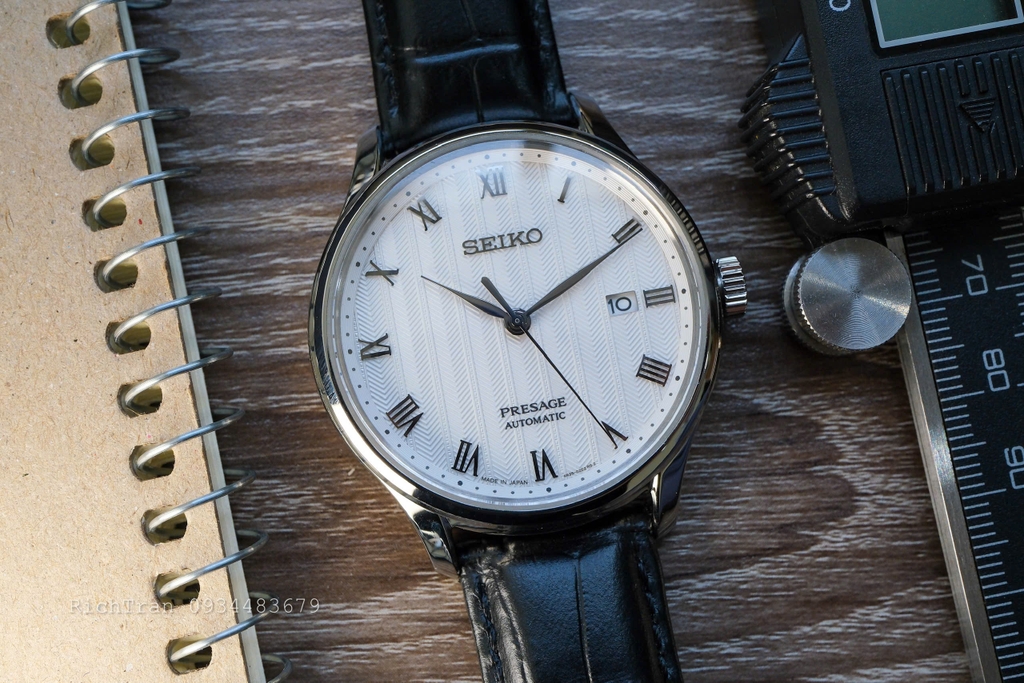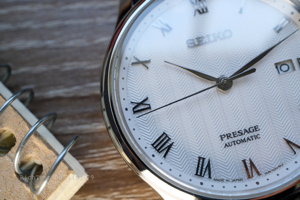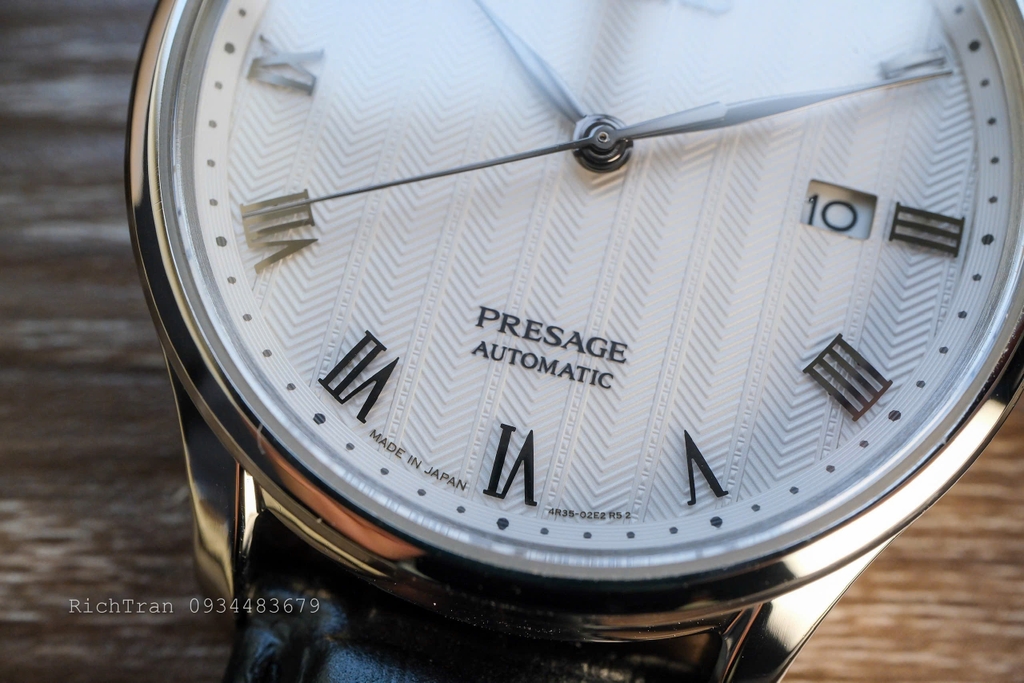 Thiết kế đậm chất classic với mặt số trắng vân sọc, kim lá liễu đi kèm bộ cọc số la mã.
