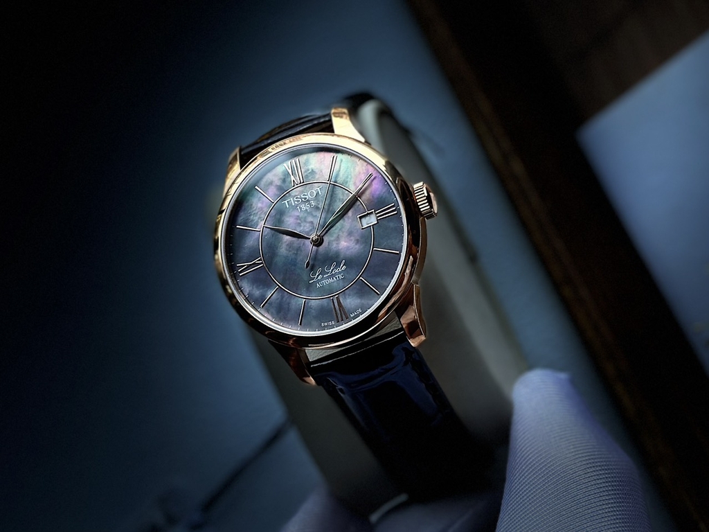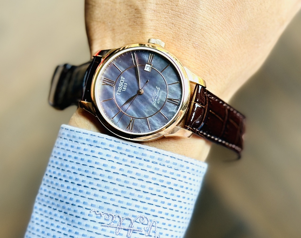 Thuộc dòng sản phẩm Le Locle cao cấp với mặt số khảm trai cùng dial ánh nâu rất đẹp và lạ mắt. Bộ cọc số la mã kết hợp cọc vạch tạo nên một thiết kế chuẩn Classic và Dress